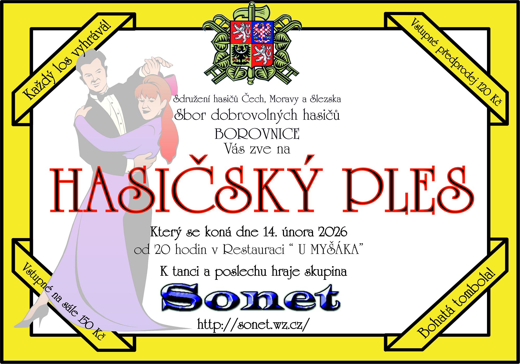 Sbor dobrovolných hasičů Borovnice pořádá ples. Koná se v sobotu 14.února 2026 od 20:00 hodin v Restauraci U Myšáka.